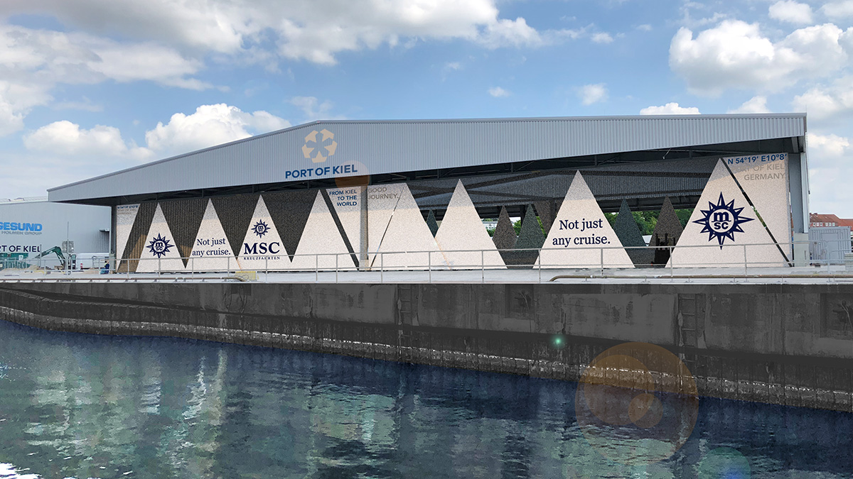 Auf dem Ostuferhafen der Kieler Förde ziert nun diese Segelfassade eine ehemalige Lagerhalle. In der boomenden Kreuzfahrtbranche werden immer mehr Empfangshallen für Passagiere und für die Gepäckabfertigung benötigt. Mit der neuen Segelfassade, die die Reisenden vor Wind und Wetter schützt, kann die Lagerhalle optimal umgenutzt werden. Und nicht nur funktional erfüllen die Segel ihren Zweck, sondern sie sind auch ein echter Hingucker.