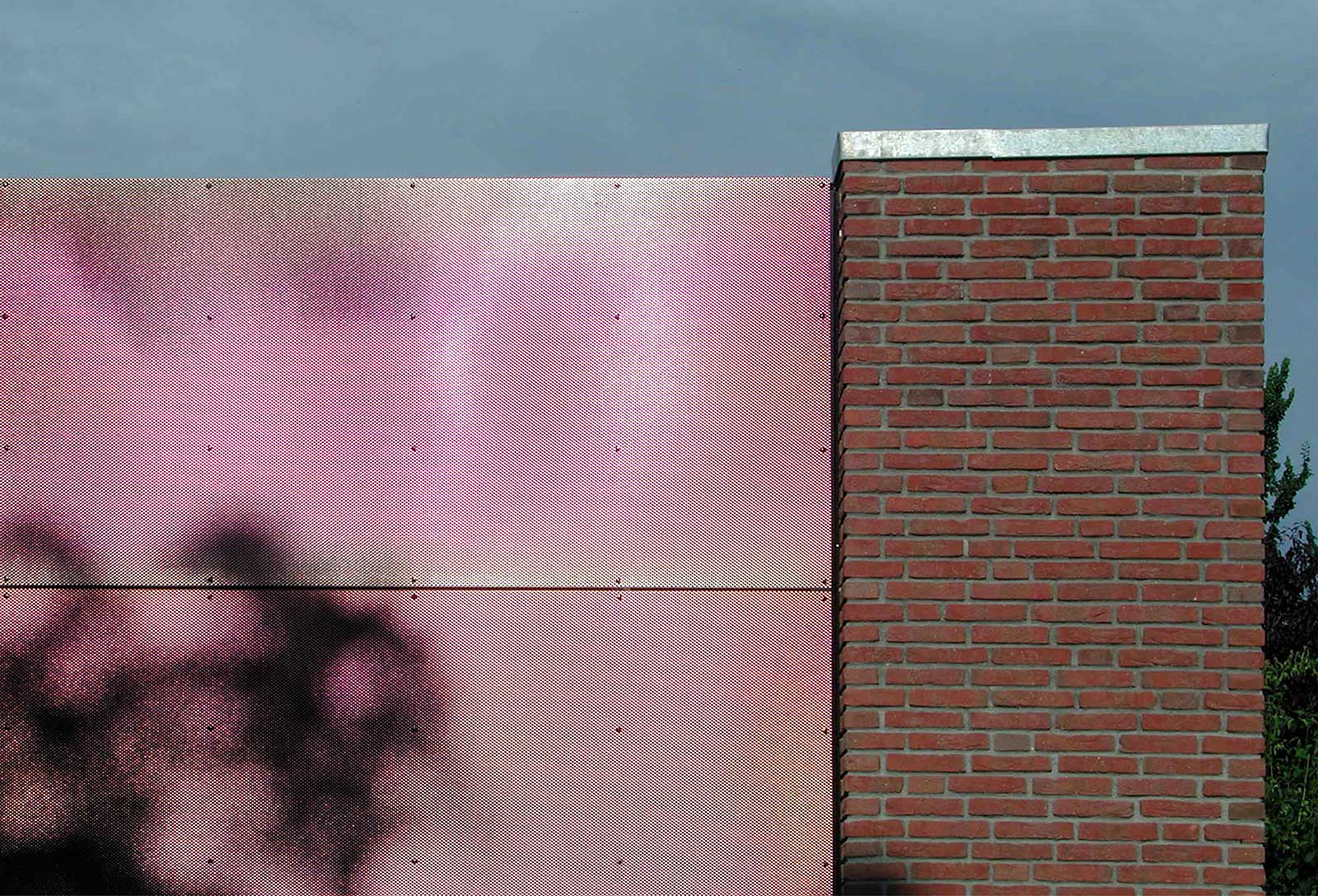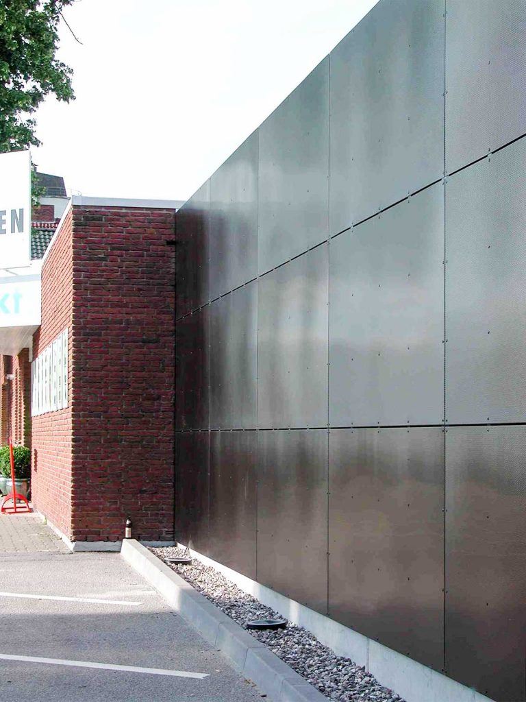 Nachdem Anfang der 90er Jahre ein Getränkefachhandel an ein Bürohaus angebaut wurde, musste es Ende der 90er aus Platzgründen erweitert werden. Das neue Lager erhielt eine spezielle rostfreie Edelstahlfassade aus Lochblech. Dank des sogenannten Inox-Spectral-Verfahrens, bei dem es sich um einen elektro-chemischen Prozess handelt, entfalten sich unterschiedliche Farbwirkungen auf dem Edelstahl. Dieses nachhaltige Verfahren macht die Fassade noch heute zum Hingucker.
